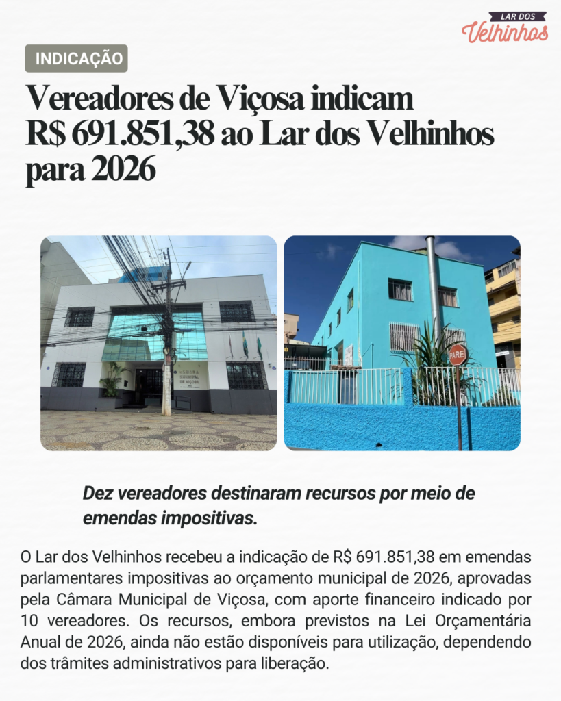 Os valores indicados ao Lar dos Velhinhos fazem parte do orçamento de 2026, mas ainda não estão disponíveis para uso. A liberação dependerá dos prazos e procedimentos definidos pela Secretaria Municipal de Assistência Social e pela Secretaria Municipal de Saúde de Viçosa.