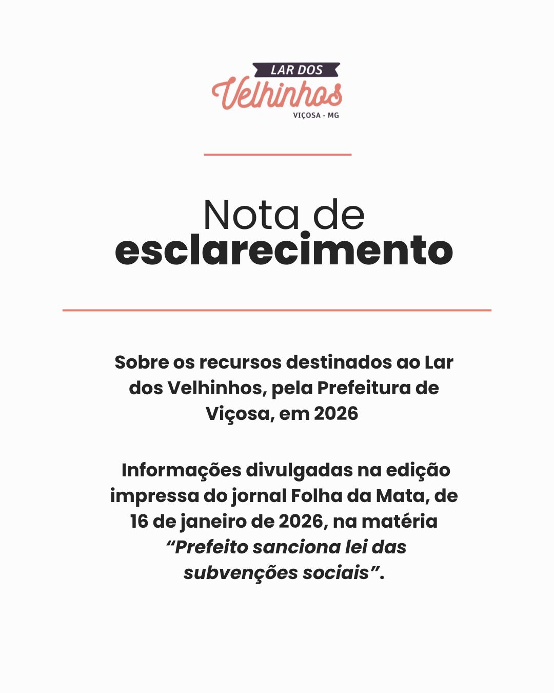 O Lar dos Velhinhos de Viçosa vem a público esclarecer informações divulgadas na edição impressa do jornal Folha da Mata, de 16 de janeiro de 2026, na matéria intitulada “Prefeito sanciona lei das subvenções sociais”. Na referida publicação, houve um equívoco ao informar que o Lar dos Velhinhos seria uma das instituições que mais receberá recursos do Município em 2026, totalizando R$ 1.544.400,93, valor apresentado como a soma de verbas destinadas pelo Poder Executivo e pelo Poder Legislativo.