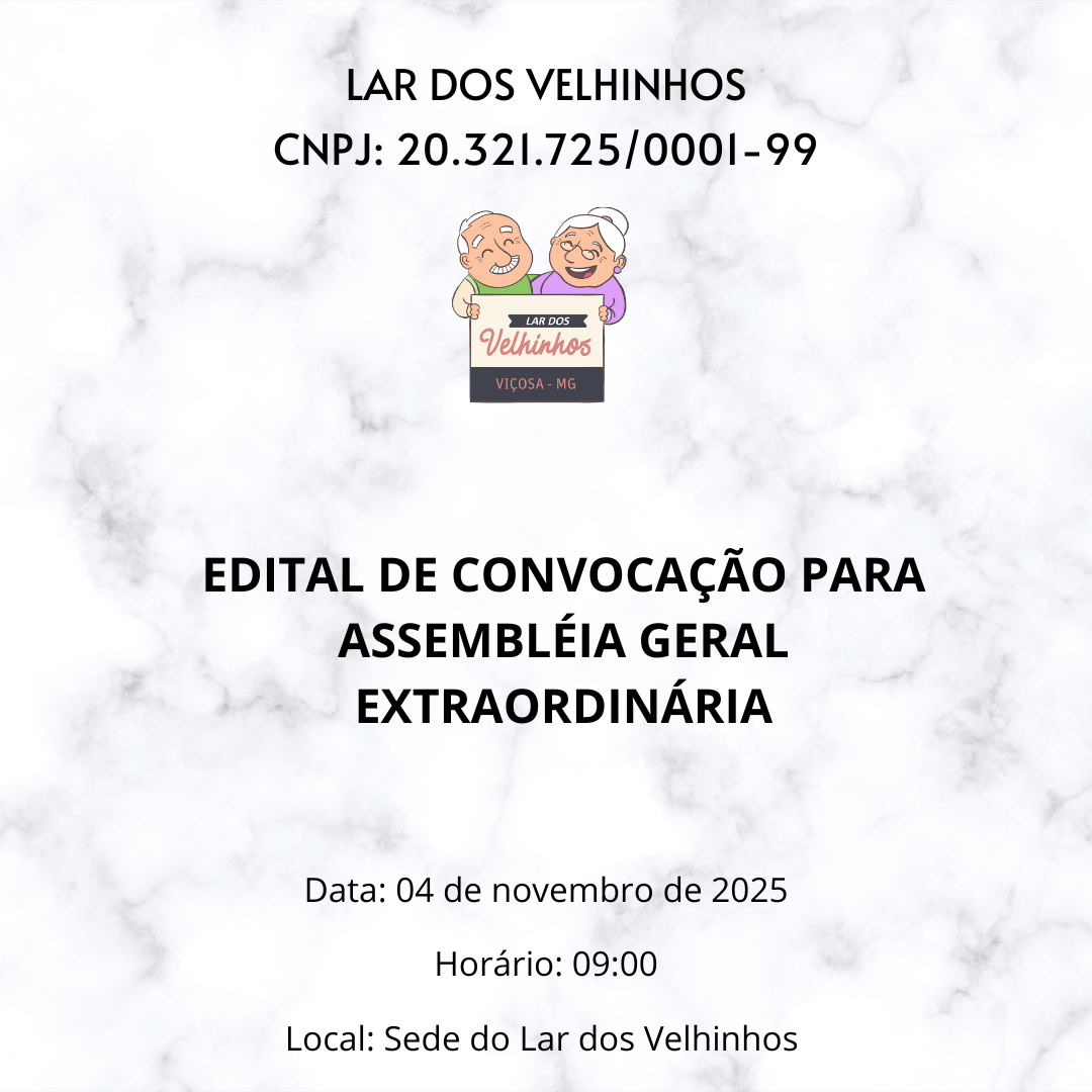 LAR DOS VELHINHOS CNPJ: 20.321.725/0001-99 EDITAL DE CONVOCAÇÃO DE ASSEMBLEIA GERAL EXTRAORDINÁRIA A Presidente do Lar dos Velhinhos, no uso das atribuições que lhe são conferidas pelo Estatuto Social, convoca todos os associados regularmente inscritos e em pleno gozo de seus direitos estatutários para participarem da Assembleia Geral Extraordinária, a realizar-se no dia 04 de […]
